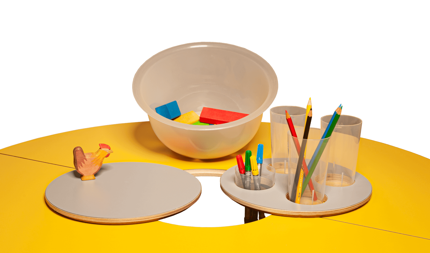 Galdam ir praktisks apaļš dizains ar maināmu centru — tajā iespējams ievietot zīmuļu krūzītes vai rotaļlietu bļodu. Kāju balsti ir regulējami, lai nodrošinātu ergonomisku sēdēšanu dažāda vecuma bērniem.
